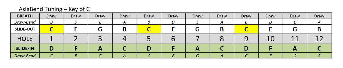 Unlike other harmonicas of similar universal bending ability (eg. the Hohner XB-40), my AsiaBend uses only draw breath direction throughout the whole instrument to create the main scale and bent notes, and has no windsaver flap valves! Instead of valves the AsiaBend uses the slider action of an airtight chromatic harmonica to isolate reed pairs and select the bending function. It employs normally-silent blow x-reeds paired with active draw reeds to allow every draw reed to be bent controllably in pitch to adjacent scale notes. Its scale layout is designed to allow the player to controllably bend every note of a diatonic major scale (and related modes) up to and down from other notes of the scale, as well as microtones in between. The fact it has no valves means that the overblow technique is available on every hole to obtain extra chromatic notes.