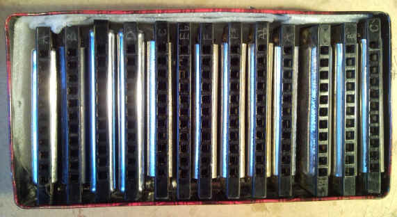 My harp case from the early 1980s, with a full set of 11 Hole harps in Power Regular Breath Tuning. Note the use of Half-Valving: it was pioneered on these harps and first recorded on Country Harmonica, 1984.